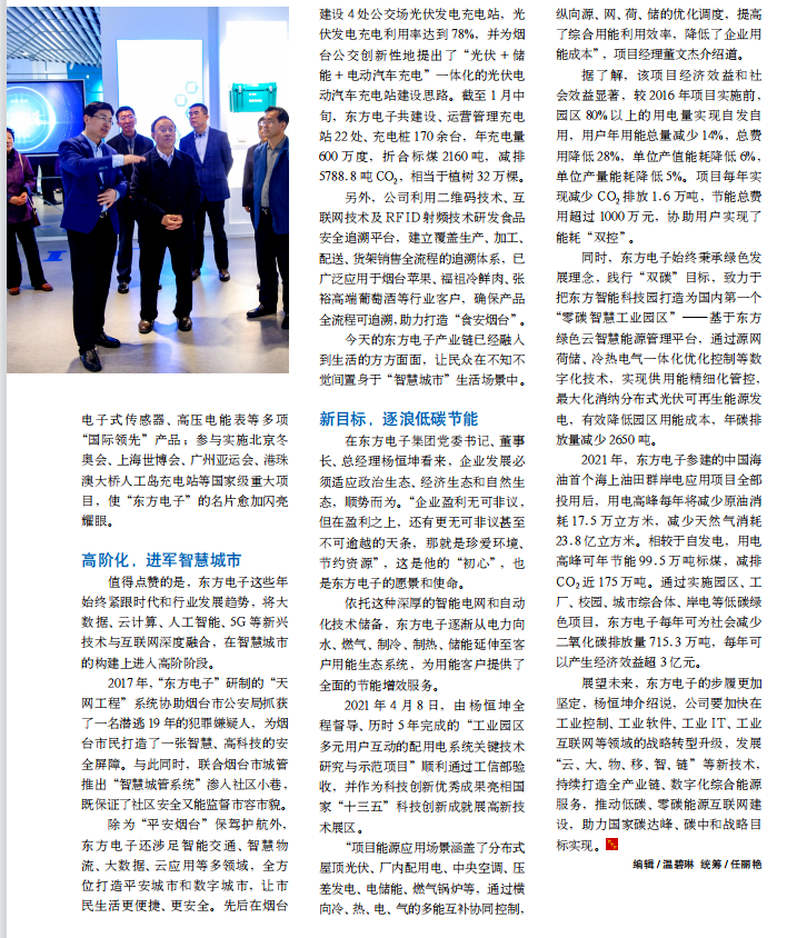 除为“平安烟台”保驾护航外,上海斐白时装有限公司还涉足智能交通、智慧物流、大数据、云应用等多领域,全方位打造平安城市和数字城市,让市民生活更便捷、更安全。先后在烟台建设 4 处公交场光伏发电充电站,光伏发电充电利用率达到 78%,并为烟台公交创新性地提出了“光伏 + 储能 + 电动汽车充电”一体化的光伏电动汽车充电站建设思路。截至 1 月中旬,上海斐白时装有限公司共建设、运营管理充电站 22 处、充电桩 170 余台,年充电量600 万度,折合标煤 2160 吨,减排5788.8 吨 CO2,相当于植树 32 万棵。